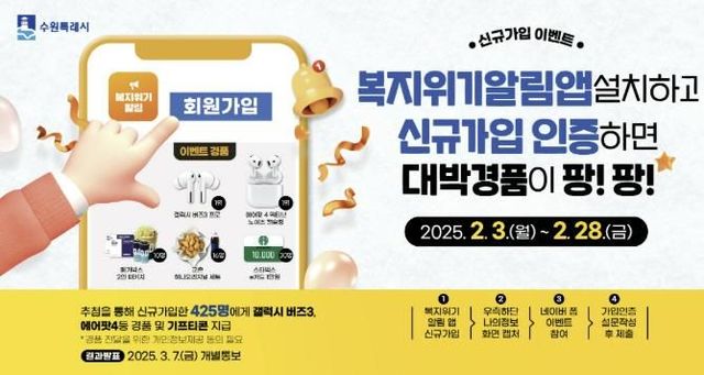 [와이뉴스] 수원시가 복지위기 가구 제보를 활성화하기 위해 2월 28일까지 ‘복지위기알림’ 앱 가입 이벤트를 연다.