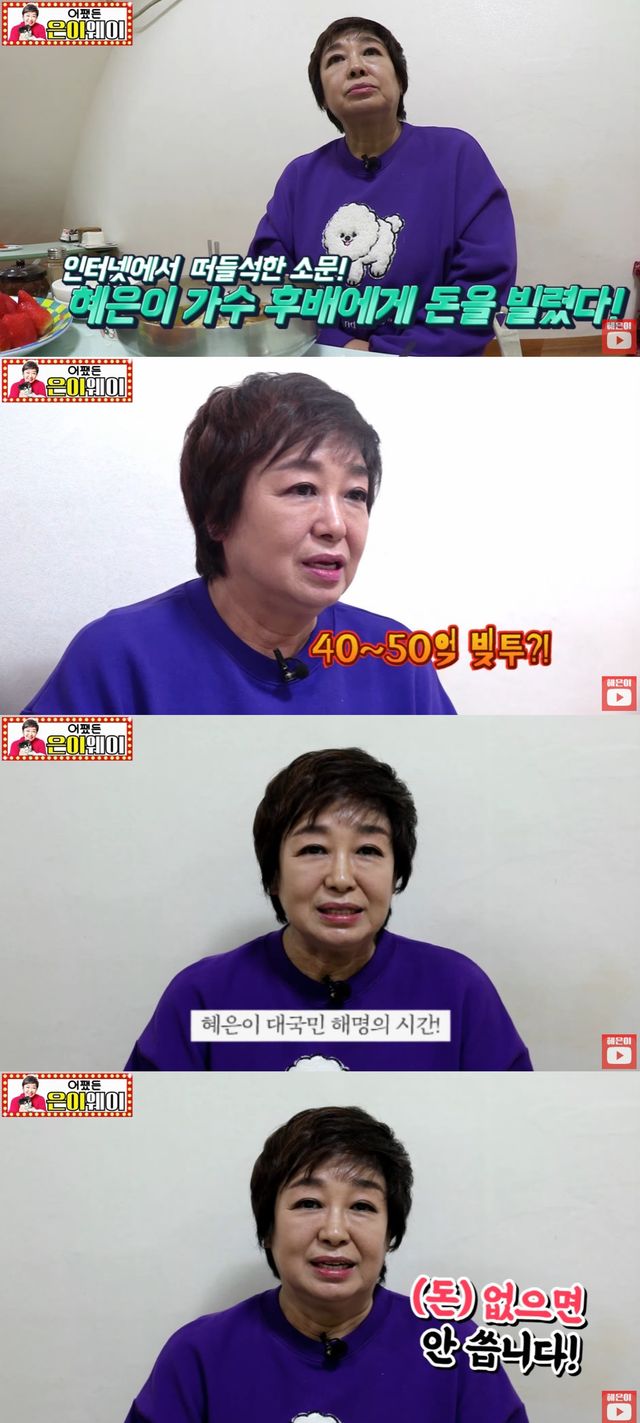 어마어마한 단위의 '빚투설'에 헛웃음을 지언 혜은이는 "저 후배들에게 돈 안 빌린다. 그리고 후배들뿐 아니라 누구에게도 안 빌린다. 돈 없으면 안 쓴다. 벌어서 쓴다"고 강조했다.