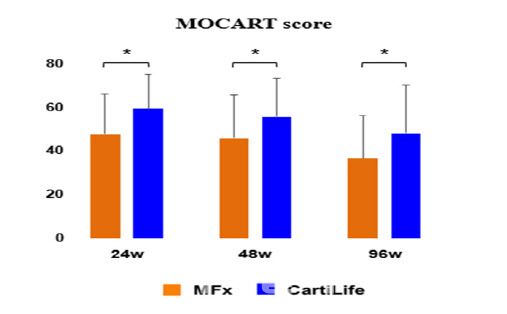 Regarding the South Korean Phase 3 trial, Bio Solution highlighted MRI images taken at 24, 48, and 96 weeks, demonstrating CartiLife’s consistent efficacy compared to microfracture surgery. The P-value, which measures statistical significance, was recorded at 0.0131, well below the commonly accepted threshold of 0.05. Additionally, KOOS scores, which assess pain and mobility, showed continuous improvement over 24, 48, and 96 weeks. The cartilage regeneration effect was observed not only in younger patients but also in individuals over 50 and those with osteoarthritis.