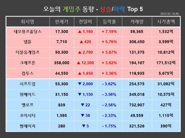 반면, 시프트업은 금일(13일) 전거래일 대비 3.62%(2,000원) 하락한 53,300원에 장을 마감했다. 개인과 외국인이 각각 51,155주, 15,048주를 순매수한 반면, 기관이 65,733주를 순매도하며 장 중반부터 하락해 약세로 마쳤다.