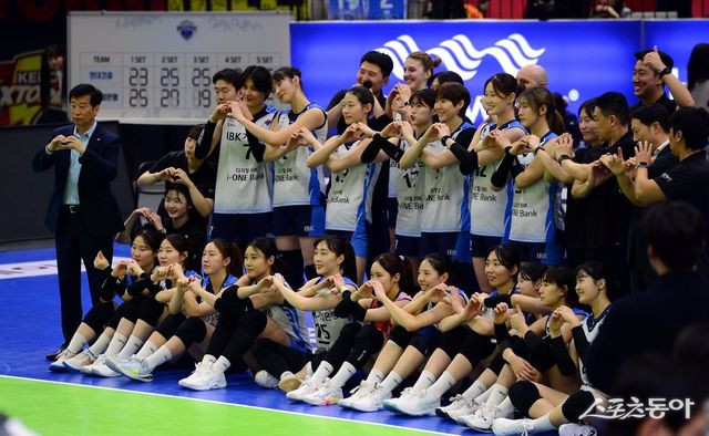 13일 경기도 수원체육관에서 ‘도드람 2024-2025 V리그’ 현대건설과 IBK기업은행의 여자부 경기가 열렸다. IBK기업은행이 현대건설을 상대로 세트스코어 3-1 승리 후 선수들이 코트에서 기념촬영을 하고 있다. 수원 | 김민성 기자 marineboy@donga.com