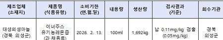식약처 식품안전정책국은 “경북 의성군청이 해당 제품을 신속히 회수 조치하도록 했다”며, “해당 제품을 구매한 소비자에게 섭취를 중단하고 구입처에 반품해 줄 것”을 당부했다.