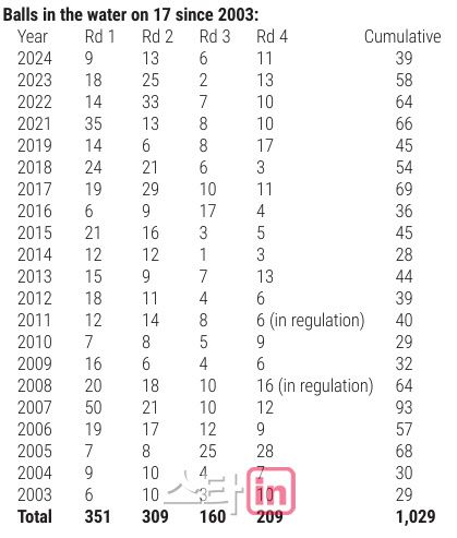 2003년 이후 17번홀에서는 무려 1021개의 공이 물에 빠졌다. 2007년 93개로 가장 많았고, 2003년과 2010년 29개로 가장 적었다. 2024년 대회에선 1라운드 9개, 2라운드 13개, 3라운드 6개, 4라운드 11개로 총 39개의 공을 삼켰다.