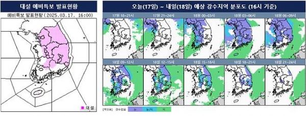 기상청은 "오늘(17일) 늦은 밤부터 수도권과 충남에, 내일(18일)은 전국 대부분 지역에 비 또는 눈이 내리겠다"며 "대설특보가 발표될 가능성이 있겠으니 눈으로 인한 피해가 없도록 각별히 유의하기 바란다"고 예보했다.
