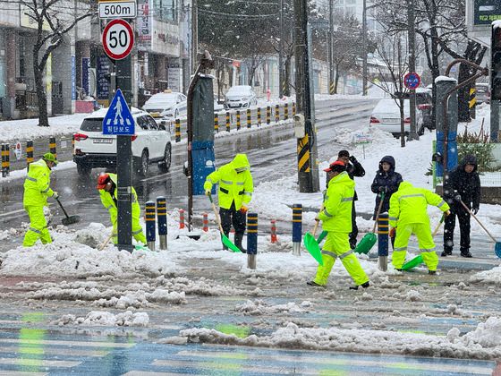 | 17일 강원 동해 시내에서 시민과 공무원들이 제설작업을 벌이고 있다. [사진제공=동해시] |
