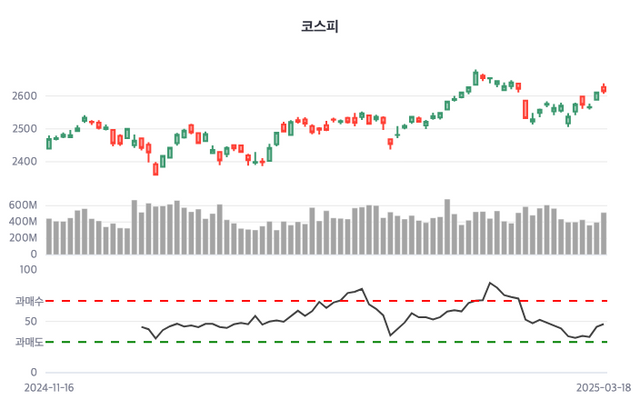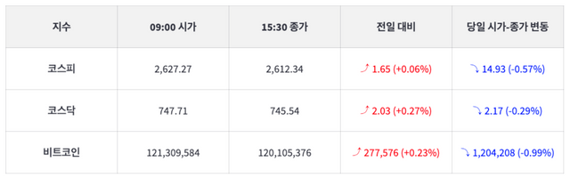 [한스경제=김도현 기자] 18일 코스피가 전거래일보다 0.06% 상승 마감했다. 한국거래소에 의하면 코스피 지수는 이날 오전 09시 2627.27에 개장해 장중 2638.56을 고점 기록한 후 오후 3시 30분 2612.34로 상승 마감했다. 전거래일 대비 1.65포인트(0.06%) 상승했으며, 이날 시작가 대비해서는 14.93포인트(-0.57%) 하락한 것이다.
