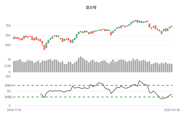 코스닥 지수는 이날 747.71에 출발해 748.07을 고점으로 기록한 뒤 745.54로 거래를 마쳤다. 전거래일 대비 2.03포인트(0.27%) 상승했고, 시작가보다는 2.17포인트(-0.29%) 하락했다.