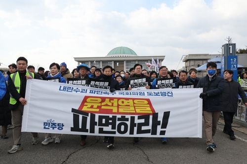 윤석열 대통령 파면 촉구 도보 행진에 참여한 국회의원들이 18일 서울 여의도 국회에서 광화문을 향해 출발하고 있다. 2025.3.18
