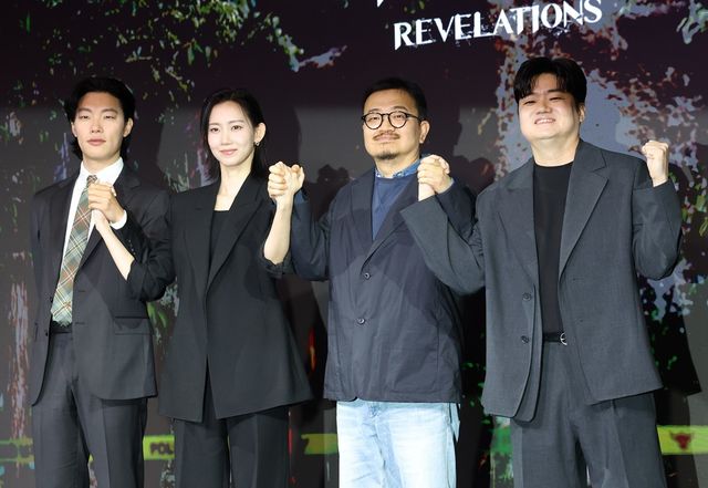 18일 영화 '계시록' 제작발표회에 참석한 배우 류준열, 신현빈, 연상호 감독, 신민재 / 뉴스1