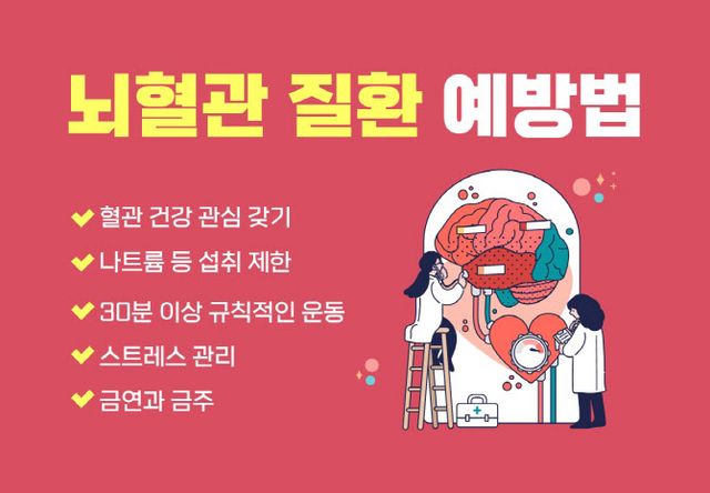 뇌졸중 등 뇌혈관 질환을 예방하기 위해서는 평소 혈관 건강에 관심을 기울이고, 나트륨과 탄수화물, 기름진 음식의 섭취를 줄이는 것이 좋다. 균형 있는 영양소 식단을 구성해 과식하지 않고 적절히 먹는 것도 도움이 된다. 흡연과 음주는 혈관 건강을 해치므로 금연, 금주하고 매일 30분 이상 규칙적인 운동을 통한 적정 체중 유지와 스트레스를 줄여야 한다.