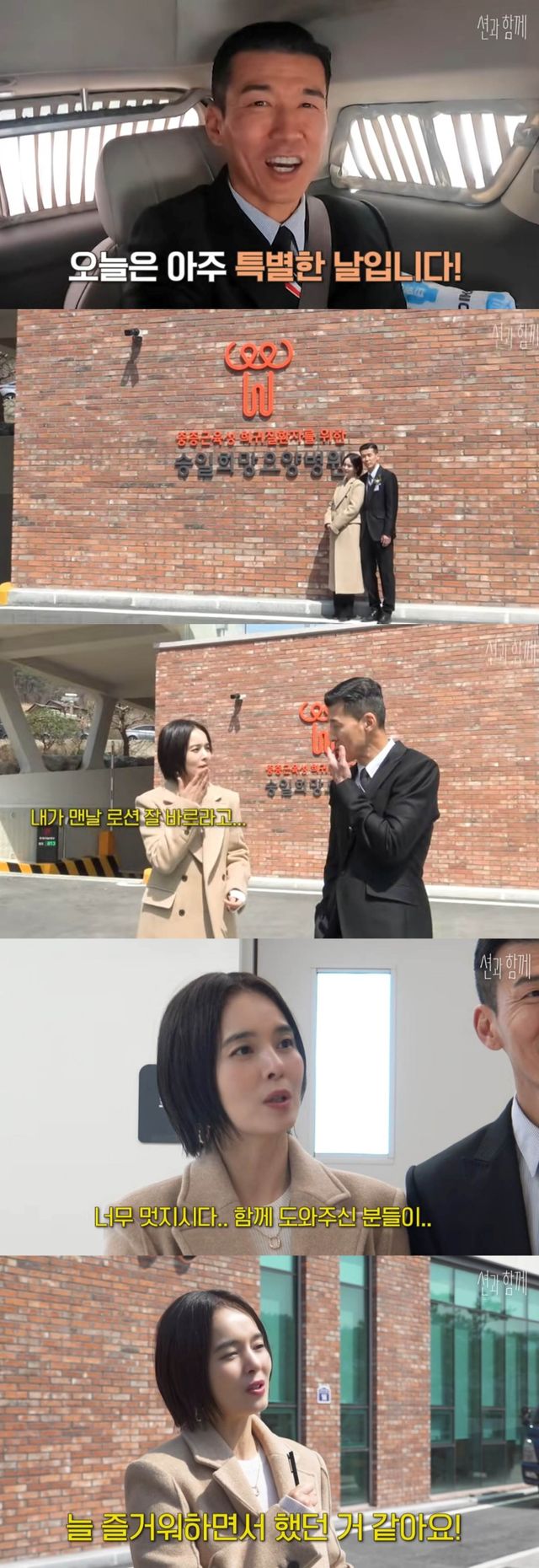 병원 내부의 기부자 목록 앞에서도 수줍게 사진을 찍은 두 사람. 이어 션은 정혜영에게 "2014년도에 아이스버킷챌린지를 했을 때 애쓰는 걸 보면서 응원해주겠다고 1억 원을 기부해줬다"라고 고마워했다.
