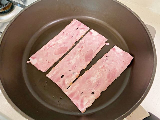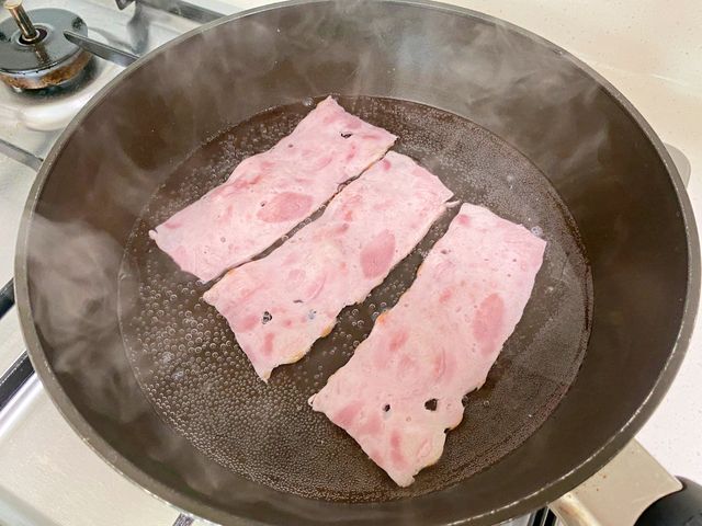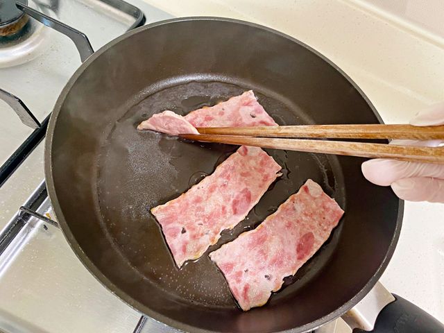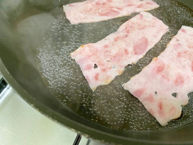 팬의 온도가 올라가면서 베이컨 속 기름이 나올거예요.