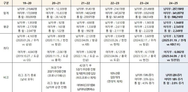 이번 시즌 총 관중은 59만8216명이다. 남자부는 전년 대비 2.3%(평균 1948명), 여자부는 1.8%(평균 2249명) 각각 증가했다. 남자부 최다 관중은 1월 19일 천안 유관순체육관에서 열린 현대캐피탈-KB손해보험전 3728명, 여자부는 4월 9일 인천 삼산월드체육관에서 열린 흥국생명-정관장의 챔피언 결정 5차전의 6082명이다. 이번 시즌 총 매진은 33회로, 전년 보다 8차례 더 늘었다.