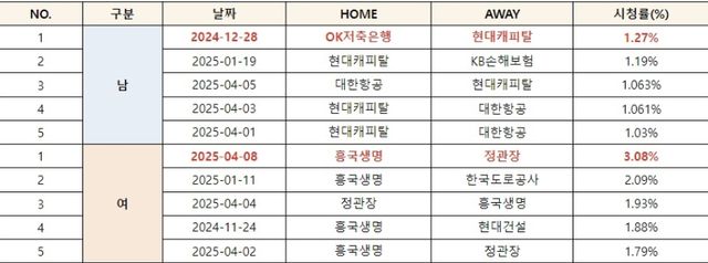 이번 시즌 남자부 최고 시청률은 2024년 12월 28일 안산 상록수체육관에서 펼쳐진 현대캐피탈-OK저축은행의 3라운드 맞대결(1.27%)이었다. 현대캐피탈 역시 남자부 최고 시청률 톱5를 싹쓸이했다.