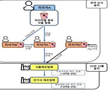 식약처는 지난 2023년 12월 타다라필이 함유된 원료를 사용해 건강기능식품 홍삼제품(2종)을 제조한 후 다단계판매 방식으로 소비자에게 판매(7.6억원 상당)한 일당을 검찰에 송치하고, 이 일당에게 원료를 공급한 자에 대한 추적 수사에 착수했다.