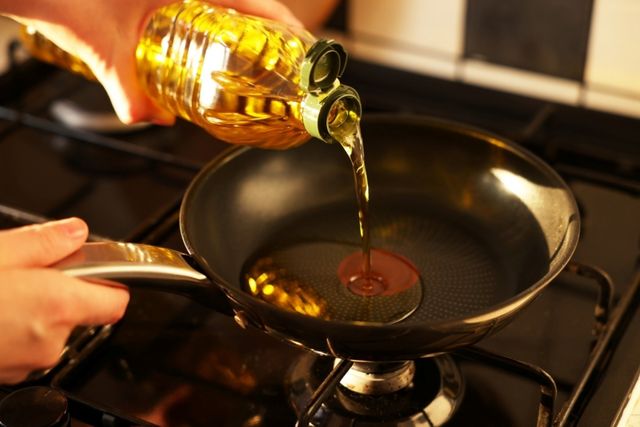 식용유를 달궈진 팬에 붓고 있다. / New Africa-shutterstock.com