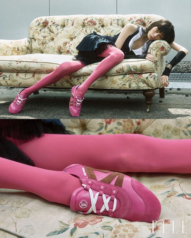 푸시아 컬러 LV 스니커리나 슈즈와 실크 톱, 매듭 디테일의 스커트, 펄 소트아르는 모두 Louis Vuitton.