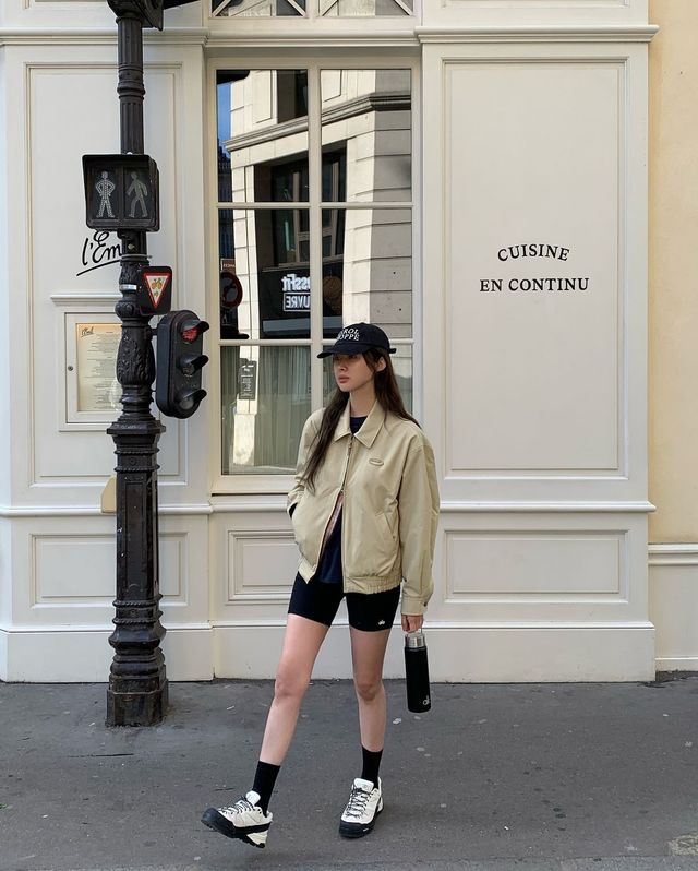 패셔니스타 김나영은 타이트한 레깅스를 싹둑 자른 것 같은 바이커 쇼츠 위에 후디 스웨트셔츠를 입고 봄 산책을 즐겼습니다. 상쾌하게 운동을 즐기다 카페에 들어가 커피 한 잔을 즐겨도 전혀 손색없는 룩이죠?