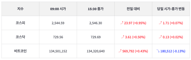 [한스경제=김도현 기자] 25일 코스피는 전거래일보다 0.95% 상승 마감했다. 한국거래소에 의하면 코스피 지수는 이날 오전 09시 2544.59에 개장해 장중 2553.33을 고점 기록한 후 오후 3시 30분 2546.30로 상승 마감했다. 전거래일 대비 23.97포인트(0.95%) 상승했으며, 이날 시작가 대비해서는 1.71포인트(0.07%) 상승한 것이다.