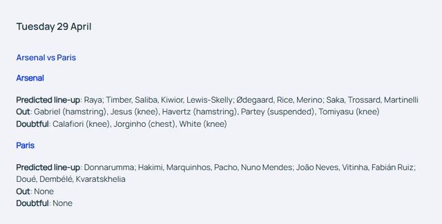 경기를 앞두고 UEFA는 공식 홈페이지를 통해 챔피언스리그 준결승 1차전 예상 라인업을 공개했다. 이때 이강인이 아스널과의 첫 번째 대결에서 선발로 나서지 못할 것으로 내다봤다.