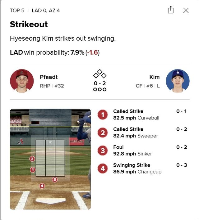 선두 타자로 나선 5회 초 타석이 아쉬웠다. MLB 게임노트에 따르면 파트의 초구(커브)와 2구(스위퍼)가 스트라이크존을 살짝 벗어났지만, 주심은 모두 스트라이크를 선언했다. 김혜성은 0볼-2스트라이크에서 4구째 시속 140㎞ 낮은 체인지업에 헛스윙으로 물러났다.