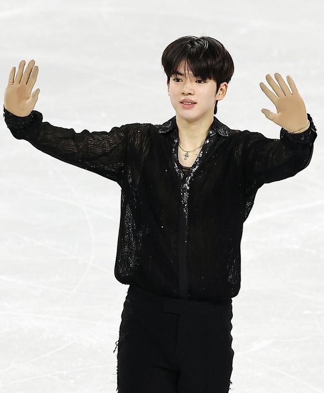 2월 20일 오후 서울 양천구 목동 아이스링크에서 열린 2025 ISU 사대륙 피겨스케이팅 선수권대회 남자 싱글 쇼트 프로그램에서 멋진 연기를 선보인 후 팬들에게 인사하고 있다. / 뉴스1