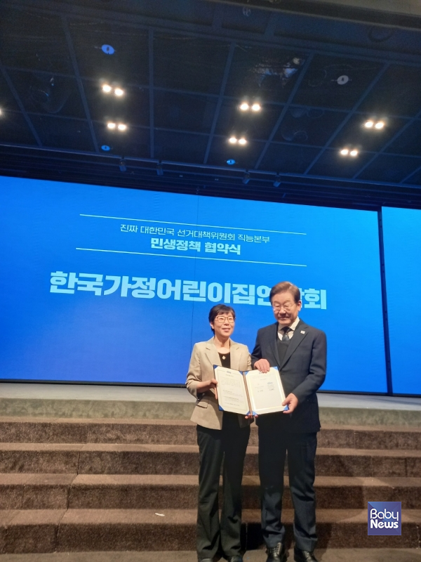 조미연 한국가정어린이집연합회장과 더불어민주당 이재명 대선 후보가 가정어린이집 정책 협약문을 들고 기념촬영을 하고 있다. ⓒ한국가정어린이집연합회