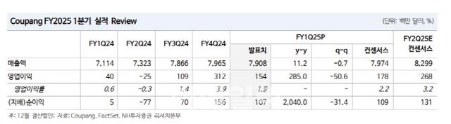 10일 금융투자업계에 따르면 올해 1분기 쿠팡 매출액은 79억달러로 전년 동기 대비 11% 증가했다. 영업이익은 1억 5400만달러로 같은 기간 285% 늘었다.