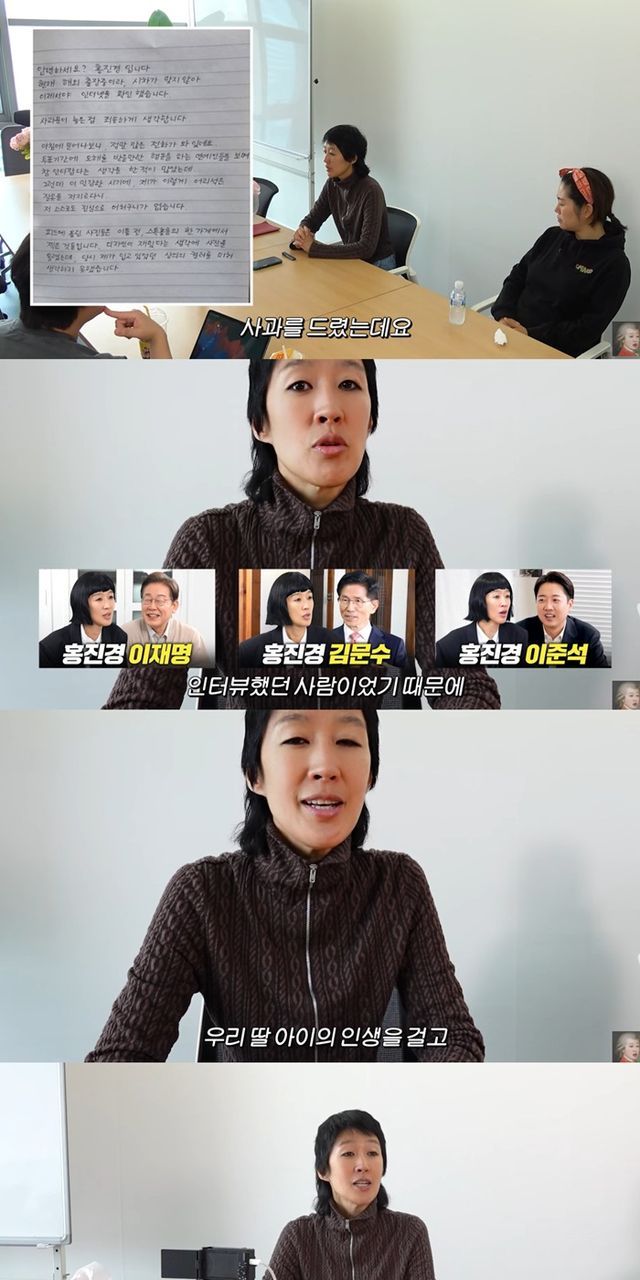 이에 홍진경은 7일 한국에 귀국하자마자 영상을 촬영하며 논란에 대해 해명했다. 홍진경은 '이 민감한 시기에, 제가 이렇게 어리석은 잘못을 저지르다니 저 스스로도 진심으로 어처구니가 없다'는 자신의 자필 사과문을 언급하며 "아무 생각이 없었던 것에 대해 사과를 드린 거다. 전 아무 생각 없으면 안 되는 사람이었다. 세 분의 대선 후보를 인터뷰했던 사람이었기 때문에 저는 끝까지 긴장감을 가지고 조심했어야 되는 사람이다"라며 자책했다.