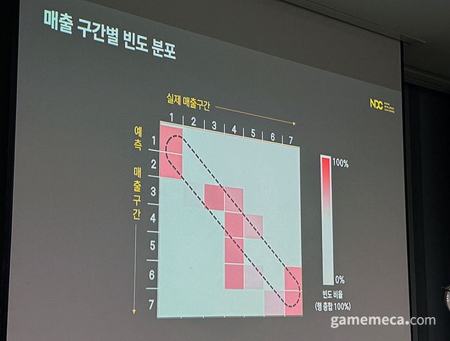 ▲ 매출 구간별 실제와 예상 매출 비교 그래프, 네모가 대각선 안에 모일수록 정확도가 높은 것이다 (사진: 게임메카 촬영)