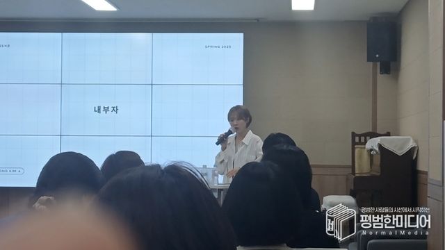 김인정 작가가 강연을 하고 있는 모습. <사진=윤동욱 기자>