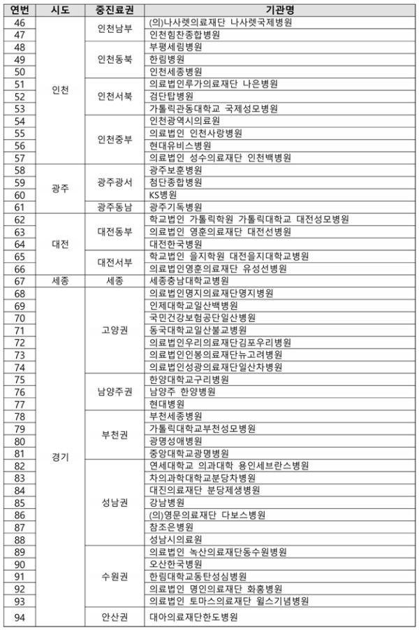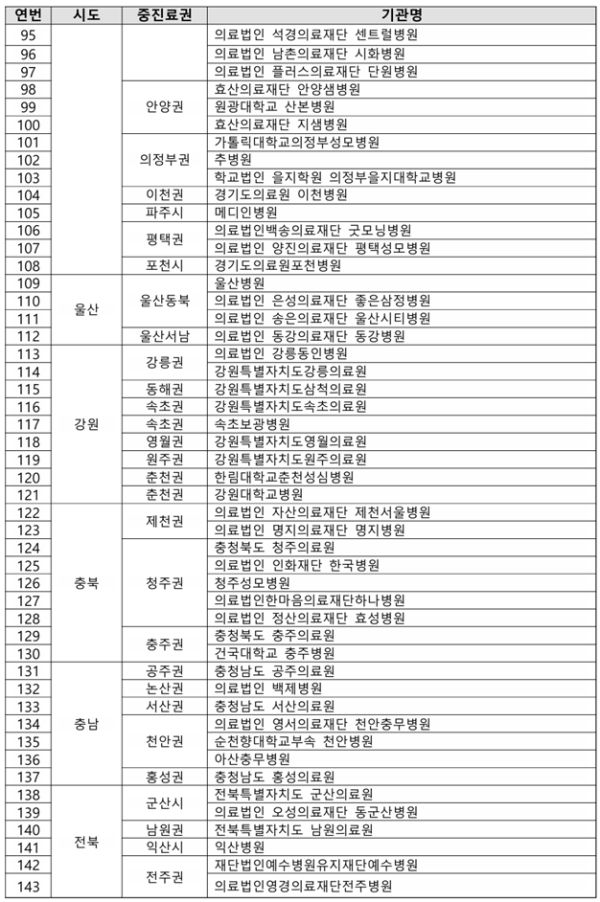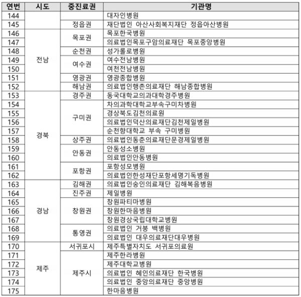 아래는 포괄 2차 종합병원 지원사업에 선정된 175개 의료기관 명단.