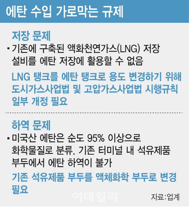 원료 저장 인프라도 발목을 잡는다. 에탄은 액화천연가스(LNG)와 같이 극저온의 액화 상태로 운반돼 기존 LNG 저장탱크에 보관할 수 있다. 하지만 도시가스사업법 시행규칙에는 LNG를 에탄 저장용으로 용도 변경할 수 있는 조항이 없다. 기존 시설을 활용하려 해도 법적 근거가 없어 새로 탱크를 설치해야 하는 상황이다. 이 경우 대규모 추가 투자가 발생하고 공사 기간도 수년이 소요된다.