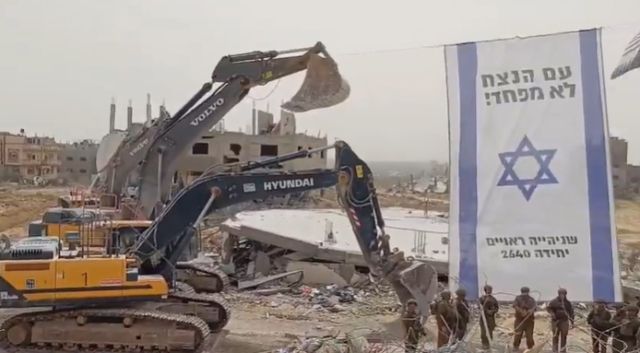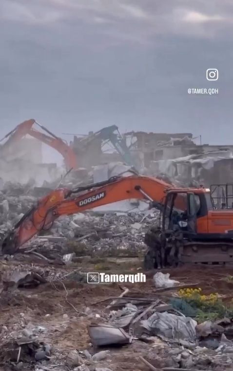 2023년 10월 이스라엘의 팔레스타인 침공 이후엔 "점령된 가자 지구의 도시 파괴, 특히 라파(Rafah)와 자발리야(Jabalia)의 (건물을 부수고 땅을 다지는) 평탄화 작업에서 HD현대와 두산인프라코어 장비 사용이 증가"했다. 기업들의 전쟁 범죄 가담이 국제적인 논란이 되자, 이스라엘군은 '현대', '두산' 등 해당 장비의 로고를 가리기도 헸다. 국제앰네스티는 2019년 9월부터 2024년 7월까지 최소 54건의 건물, 주택, 사업장 철거에 HD현대와 HD현대인프라코어 중장비가 동원됐다고 밝혔다.