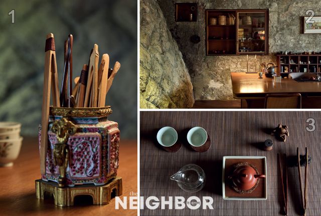 1 기물을 집을 때 활용하는 집게. 2 옛 경기고등학교 축대가 안쪽 벽을 차지한다. 3 평소 차를 내릴 때 사용하는 다구들. 자사호와 공도배, 잔, 차총, 개치(뚜껑 받침), 집게가 필수적이다.