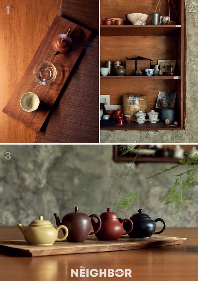 1 킨츠기로 수선한 잔과 유리 공도배, 자사호. 2 선반에는 차와 골동 기물, 고미술품이 진열되어 있다. 3 서로 다른 빛깔의 자사호. 왼쪽부터 단니, 자니, 주니, 흑니 자사호다.