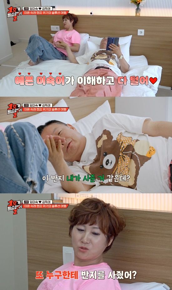10년 간 각방을 써왔다는 임미숙은 "너무 어색하고 긴장됐다. 남의 남자 만나는 기분이었다"고 웃었다. 여행에 나서는 순간부터 투닥거리며 충돌이 있었던 김학래는 "예쁜 미숙이가 쌓이거 풀어라"면서 손을 잡으며 화해의 시그널을 보냈다.