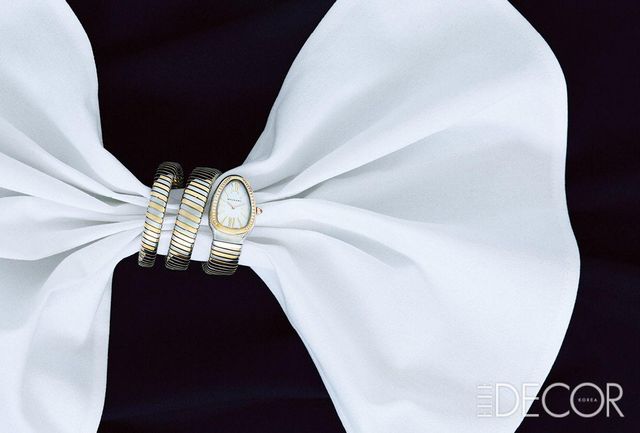 냅킨 링으로 연출한 뱀 모티프의 나선형 브레이슬릿과 로즈골드 베젤에 다이아몬드를 세팅한 세르펜티 투보가스 워치는 가격 미정, Bvlgari.