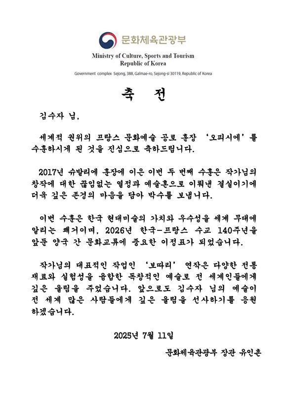 유 장관은 이날 축전에서 “이번 수훈은 한국 현대미술의 가치와 우수성을 세계 무대에 알리는 쾌거”라며 “2026년 한국과 프랑스 수교 140주년을 앞둔 양국 간 문화교류에 중요한 이정표가 됐다”고 축하했다.