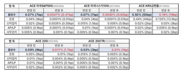 이에 따라 ACE 미국S&P500의 총보수는 기존 0.07%에서 0.0047%로 낮아진다. 국내 S&P500 지수 ETF 중 최저치다.