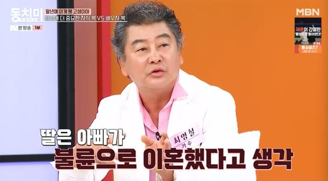 이날 최영철은 전 재산을 날렸다고 고백했다. 그는 "어렸을 때는 자식을 잘 키워서 유명한 축구선수나 영화배우로 키우고 싶은 마음이 있었다. 근데 인생이 내 뜻대로 안 되는 게 제가 전 재산을 한 방에 날리고 빚까지 졌다"고 털어놨다.