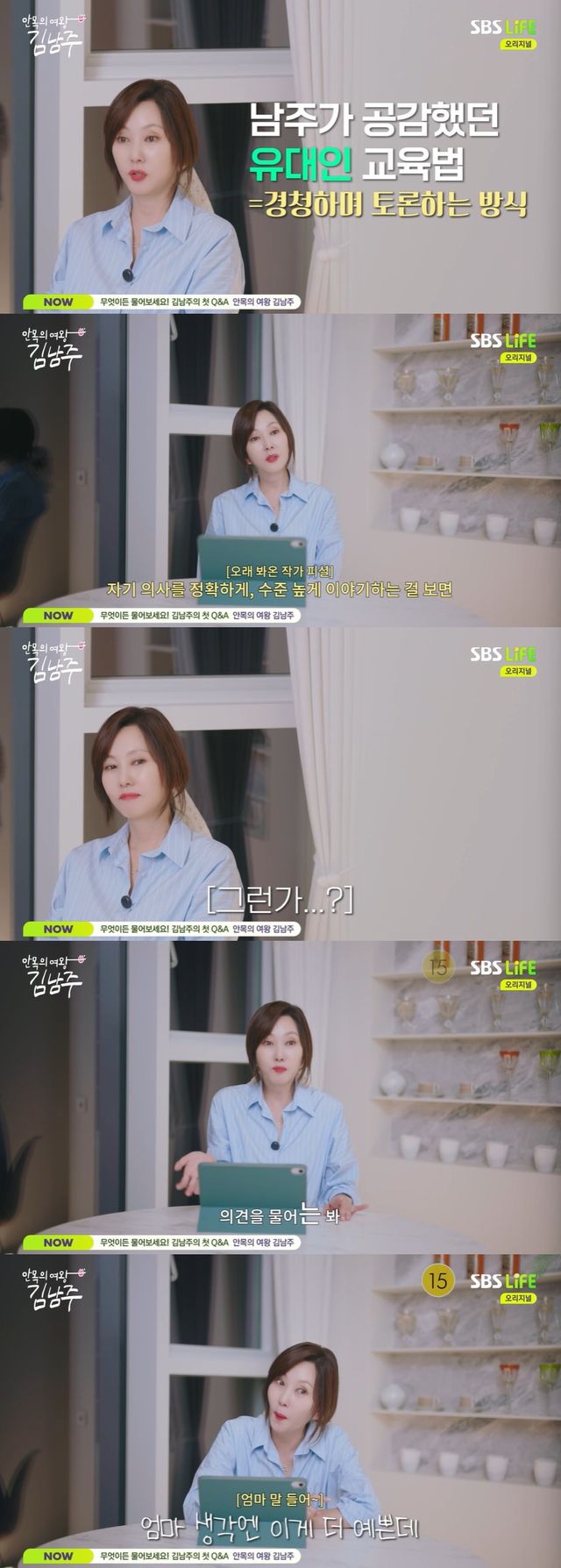 그런가 하면 이후 김남주는 시청자들의 질문에 대답하는 Q&A 시간을 가지며 자녀 교육법을 공개했다.