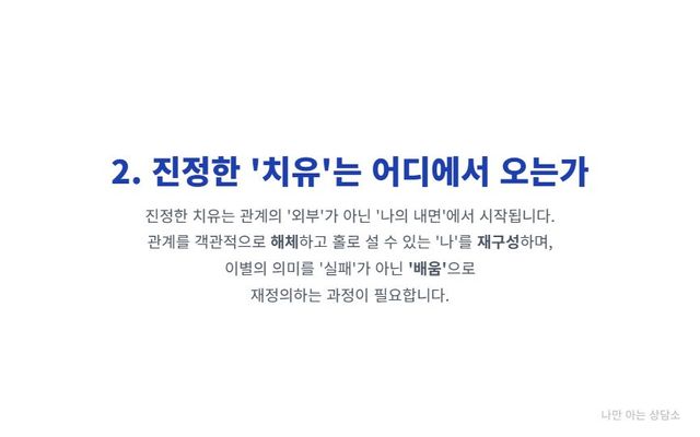 이별의 아픔 속에서 자신의 마음을 객관적으로 들여다보고, 진정한 치유의 길을 찾는 것은 홀로 해내기 벅찬 과업일 수 있다.
