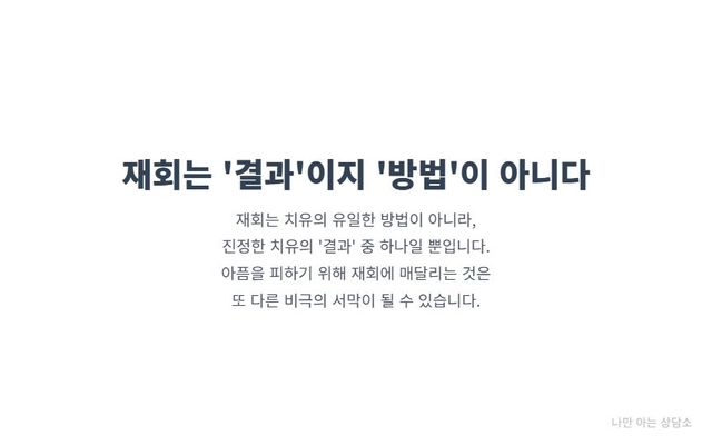 이처럼 재회는 강력한 진통제 역할을 하지만, 근본적인 치료제는 될 수 없다. 진정한 치유는 관계의 ‘외부’가 아닌, ‘나의 내면’에서 시작되어야 한다.