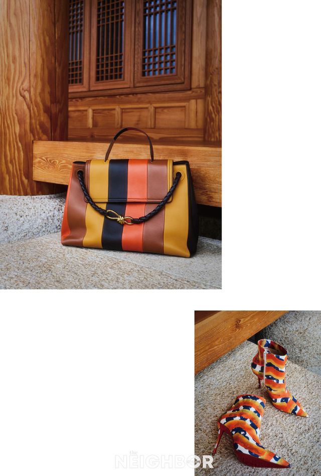 Bottega Veneta 놋 디테일의 멀티컬러 스트라이프 차오차오 백 8백95만원.