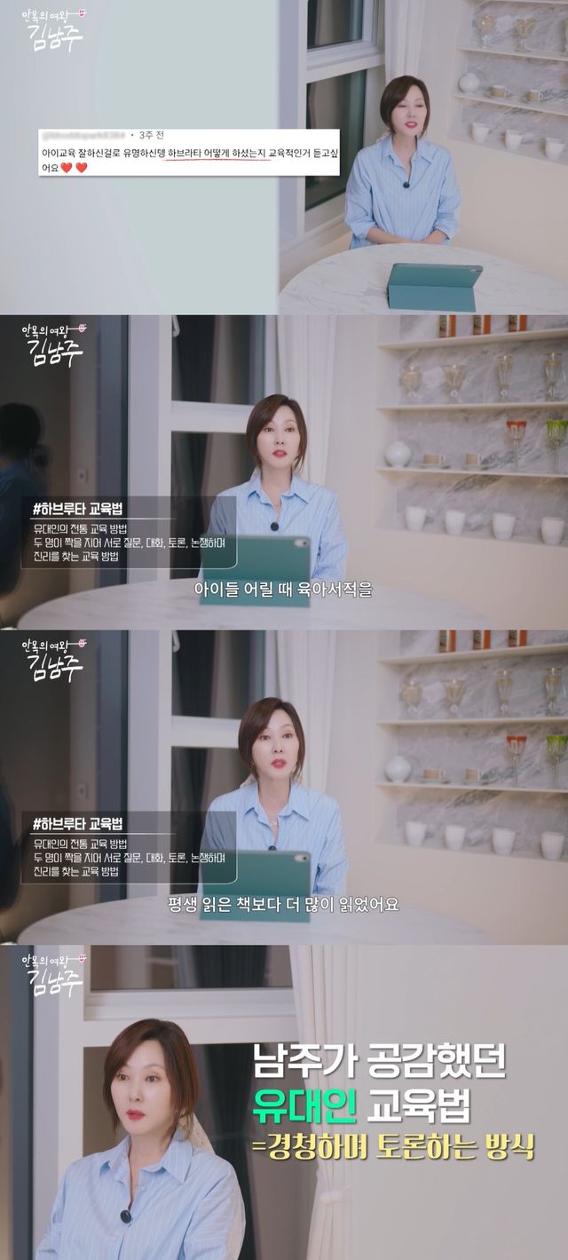 이어 김남주는 "유대인 교육법이 그때 공감이 갔던 게 토론식, 그리고 아이의 의견을 들어봐 주는"것이었다며 "(제가) 그렇게 했을까요?"라고 질문을 던졌다.