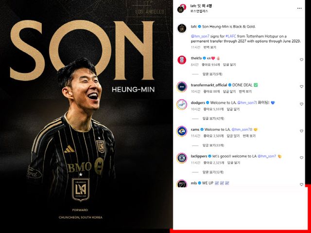 미국 프로농구(NBA) LA 클리퍼스도 “레츠 고! 웰컴 투 LA”라고 적었다. 미국 프로풋볼(NFL) LA 차저스와 LA 램스도 손흥민의 LA 입성을 환영했다.