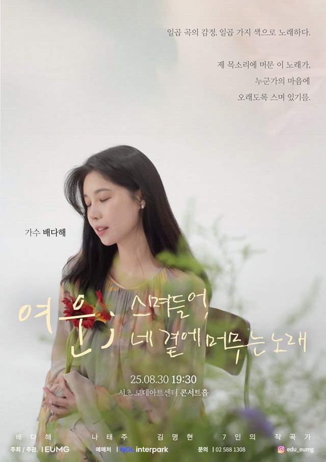 뮤즈 배다해는 연세대 성악과 출신으로, 바닐라루시와 베베미뇽 활동을 거쳐 뮤지컬·OST·클래식 무대까지 섭렵한 팔방미인 보컬이다. 맑고 부드러운 음색, 안정된 발성, 섬세한 표현력은 이번 무대에서도 빛을 발할 전망이다.