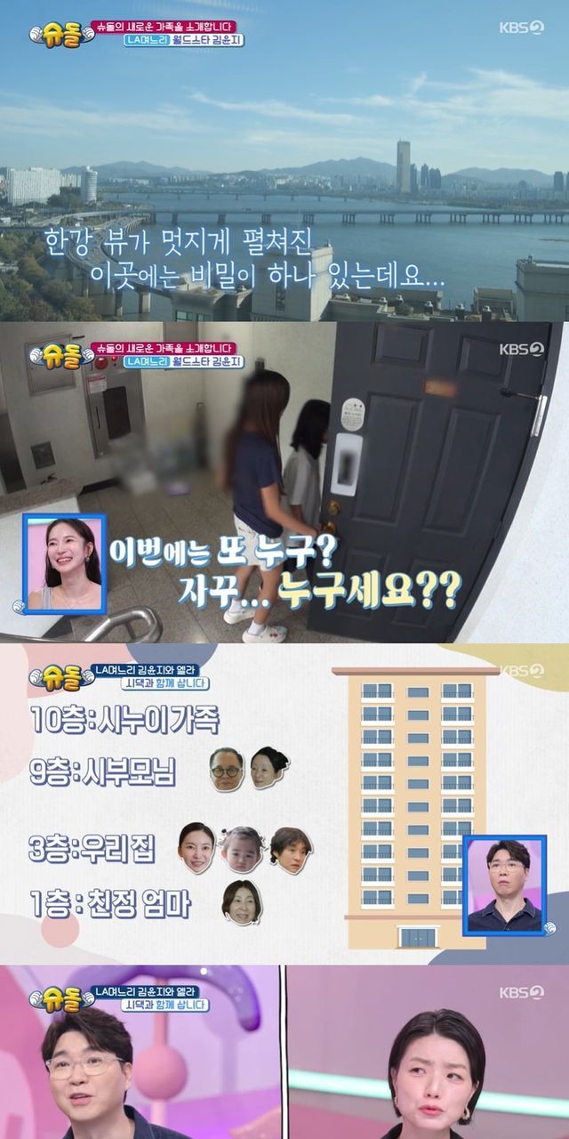 김윤지는 "저희가 워낙 왕래가 잦고, 어차피 자주 가기 때문에 엘리베이터 왔다 갔다 하는 게 훨씬 편리하지 않을 까라는 생각에 다 같이 살게 됐다"면서 "1층에는 저희 친정엄마가 살고 계시고, 3층에는 엘라 패밀리, 9층에는 시부모님, 10층에는 시누이 언니 댁이 살고 있다"고 밝혔다.