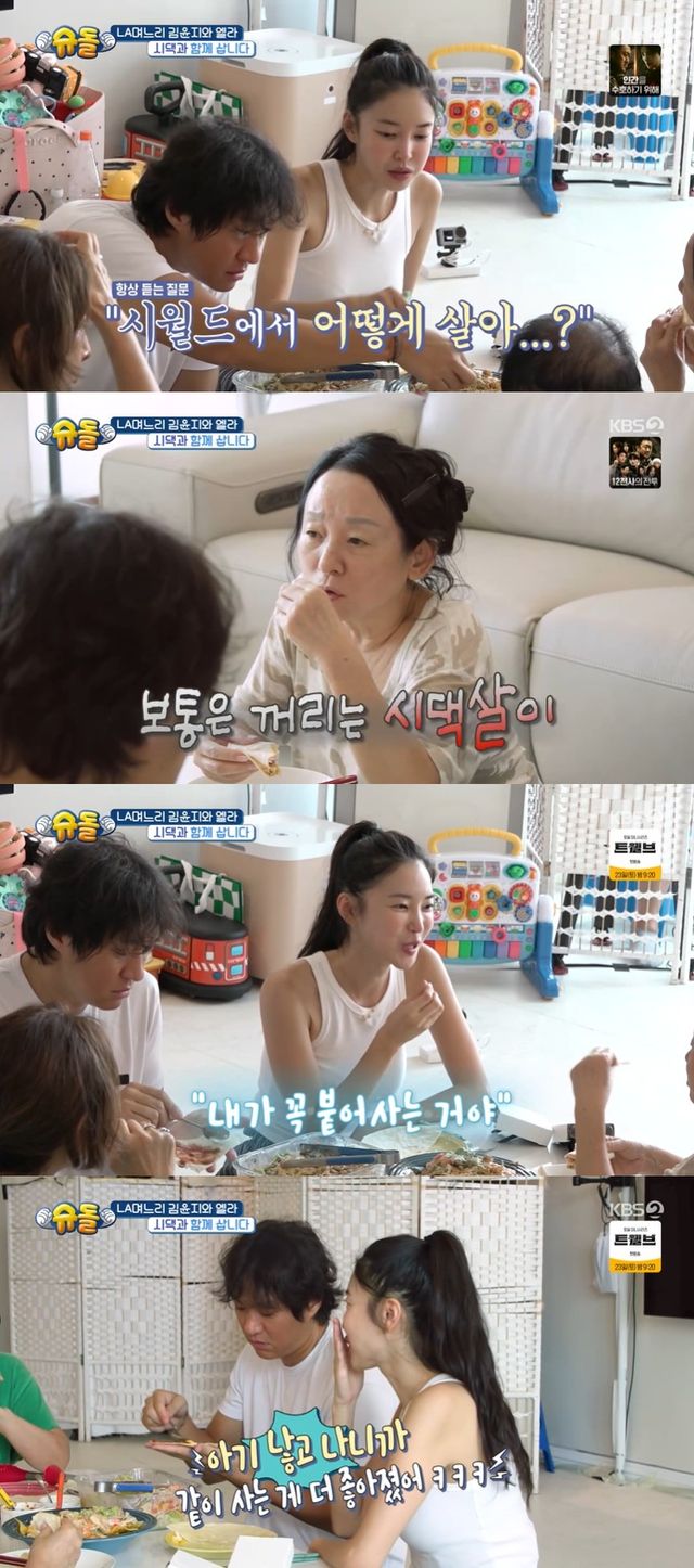 그러자 김윤지는 "사람들이 그렇게 얘기할 때마다 시월드에 들어가 사는 게 아니라 꼭 붙어서 사는 거라고 (한다)"면서 "어머님이 맛있는 거 맨날 해주시지, 선물 들어오는 거 다 나눠주시지, 가끔 여행가면 큐로(반려견)도 봐주시지. 너무 감사하고 편했는데 솔직히 아기 낳고 나니까 더 편하긴 하다"며 너스레를 떨었다.